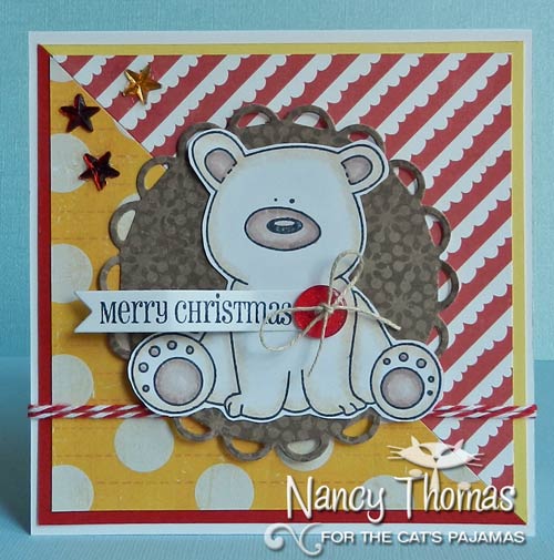 Lori is our TCP Tuesday hostess this week with a color challenge (TCPTUES183). Since I am now in full Christmas card mode I decided Big Bear would look fabulous with this color trio. After coloring with Copics, I cut the image out and attached it to a circle cut with Spellbinders Nestabilities. I cut my panels in a triangular shape in red and yellow and then matted each with the opposite color. Some twine wrapped around the card and three rhinestone stars completed the CAS look. The sentiment came from the A Beary Good Year stamp set and I cut it with the banner from the Easy Rosette CutUps.